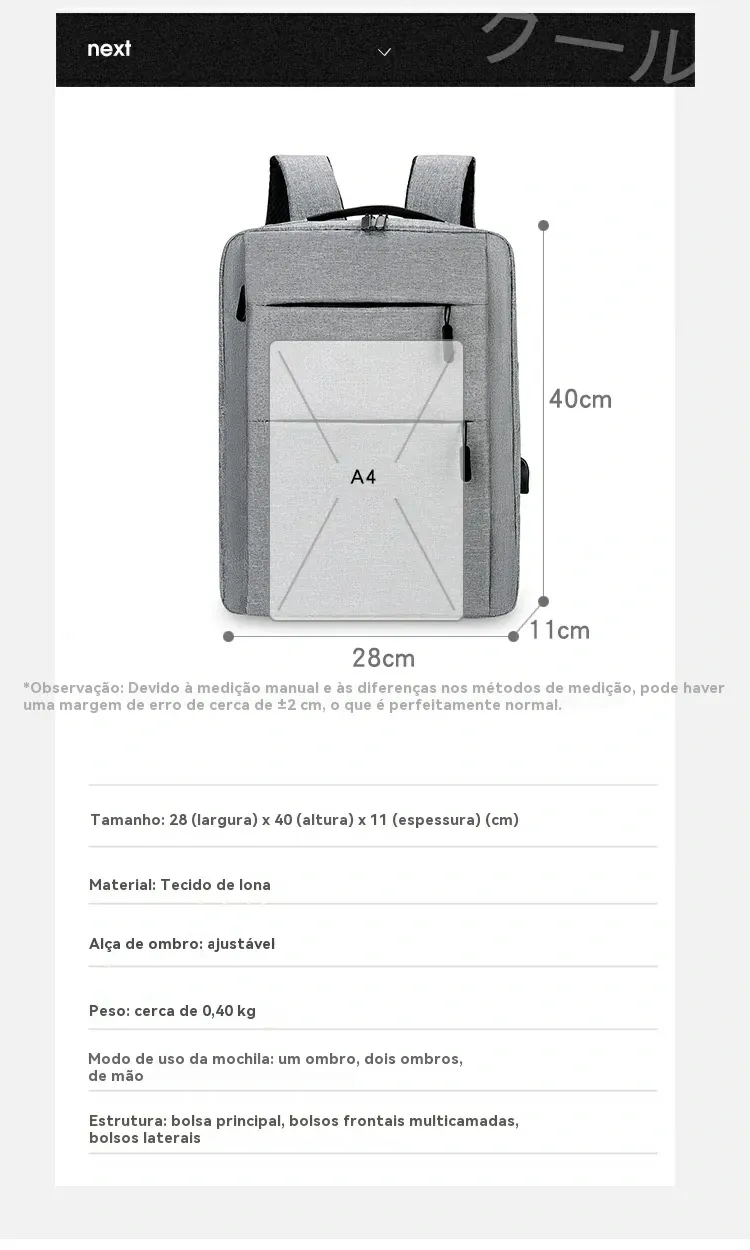 28 × 40 × 11 cm — compacta, leve e fácil de transportar.