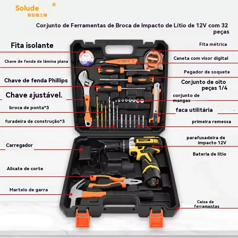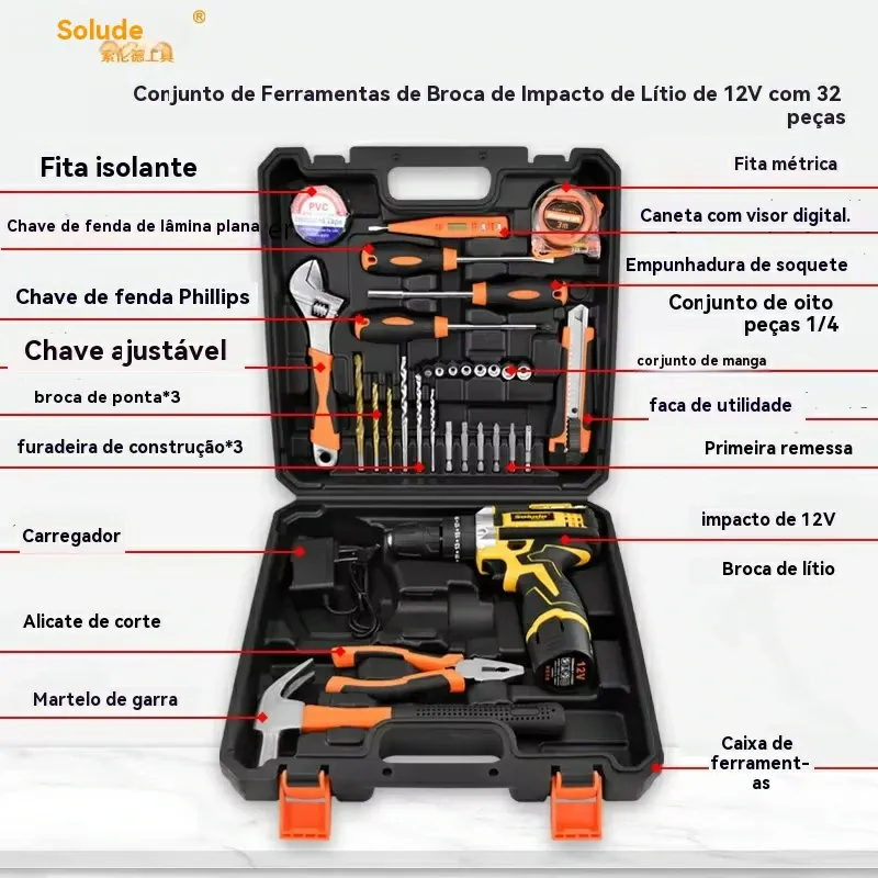 Kit Completo de 32 Ferramentas com Berbequim de Impacto 12V | Entrega em Luanda | Pagamento na Entrega