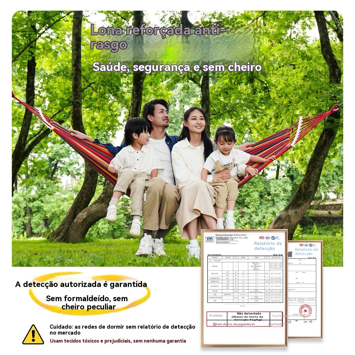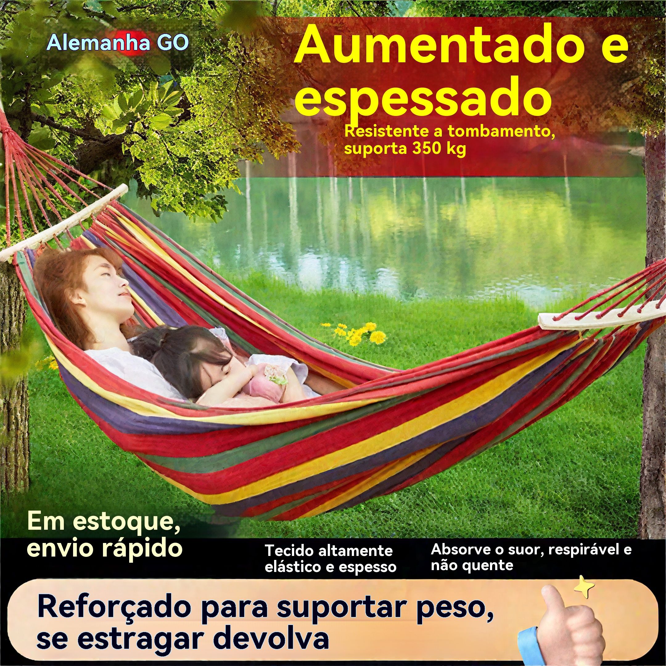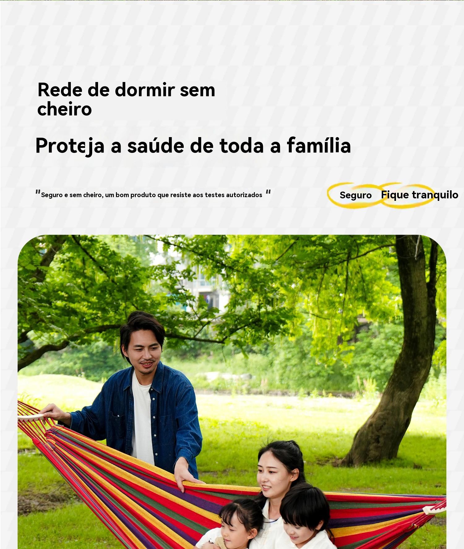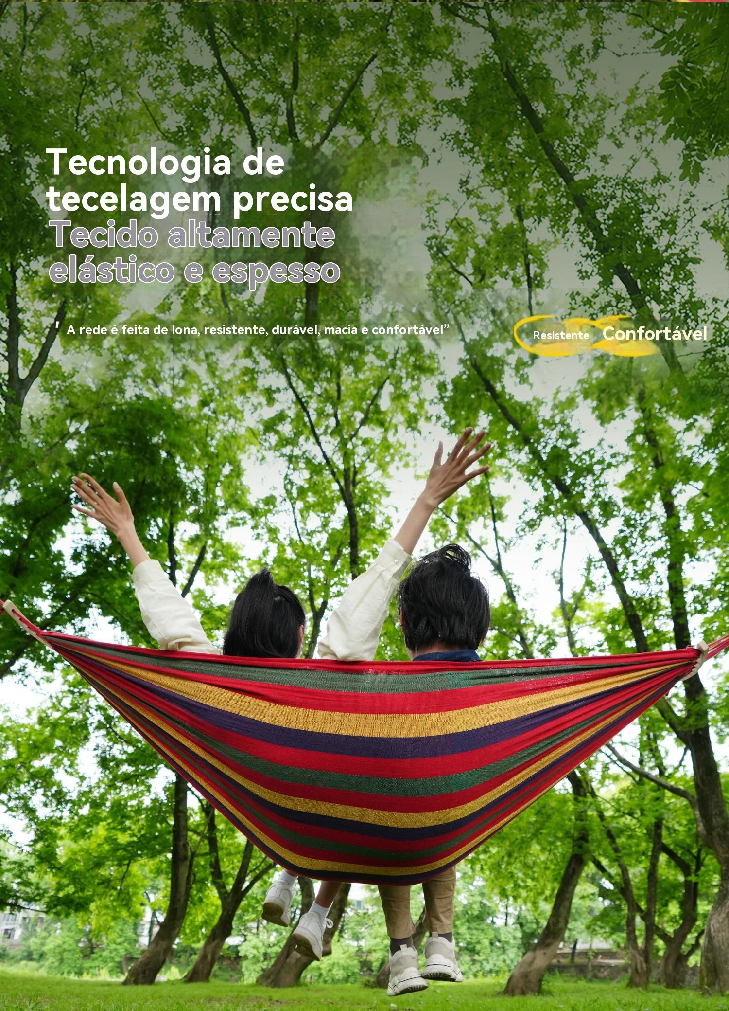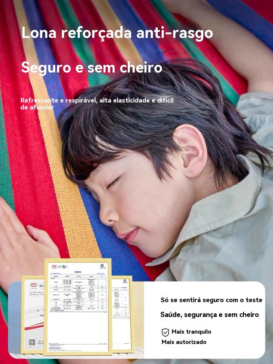 Esta rede é feita com tecido grosso e elástico, super resistente ao rasgo, durável e bem fresca — confortável até nos dias quentes.