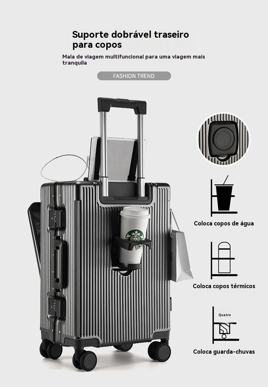 Inclui suporte para copo, gancho, suporte para tele, rodas silenciosas e pega reforçada.