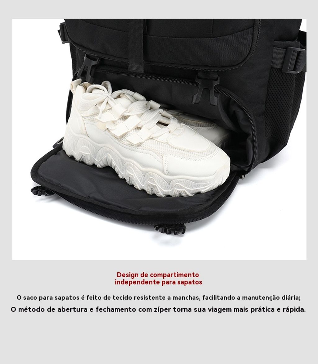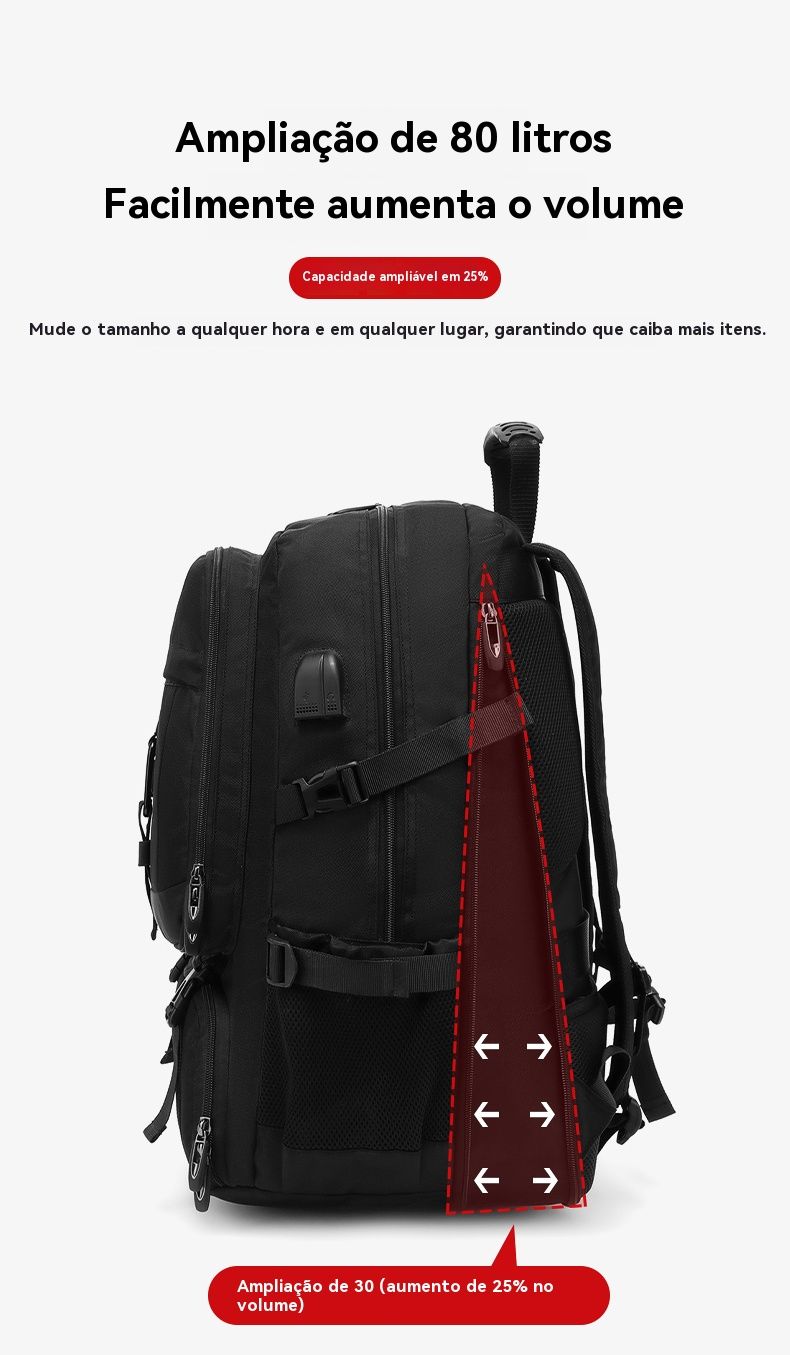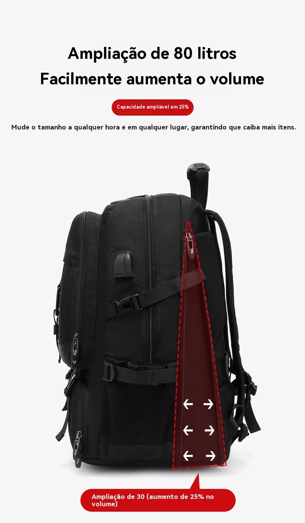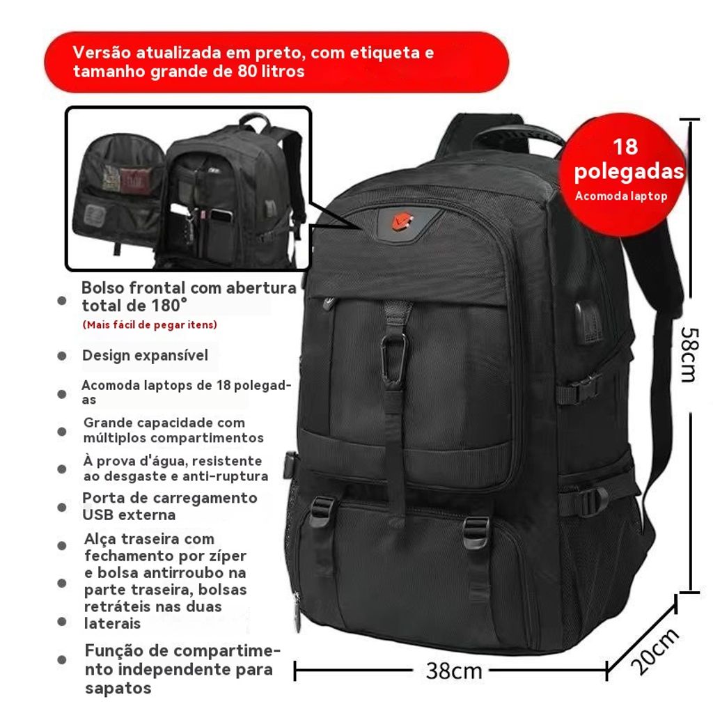 A Mochila de 80L foi feita para viagens curtas ou longas. Grande capacidade para laptop, roupas e itens pessoais, e pode ser levada no avião. Compartimento separado para sapatos, abertura de 180°/270° e encaixe na mala de viagem.