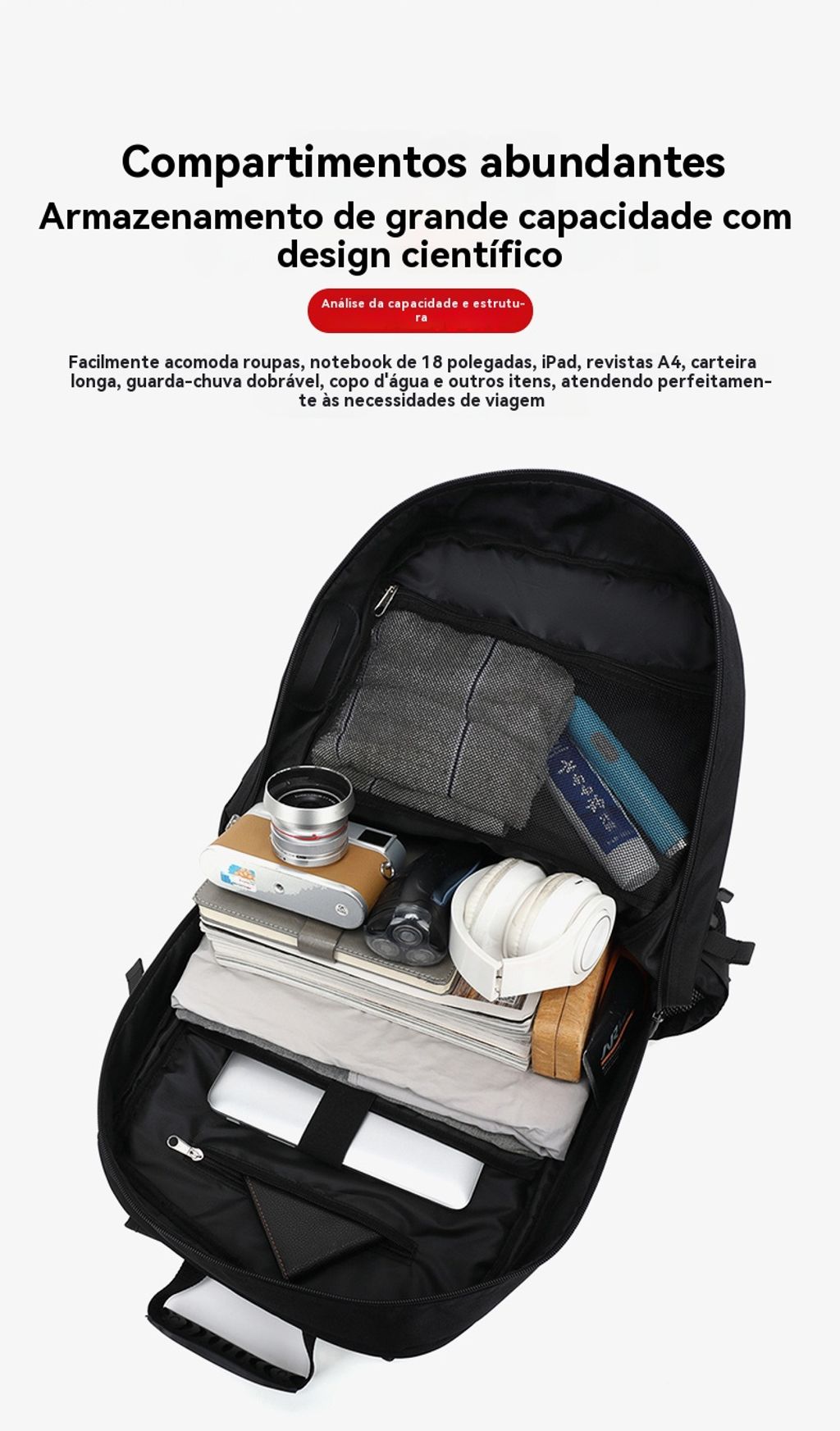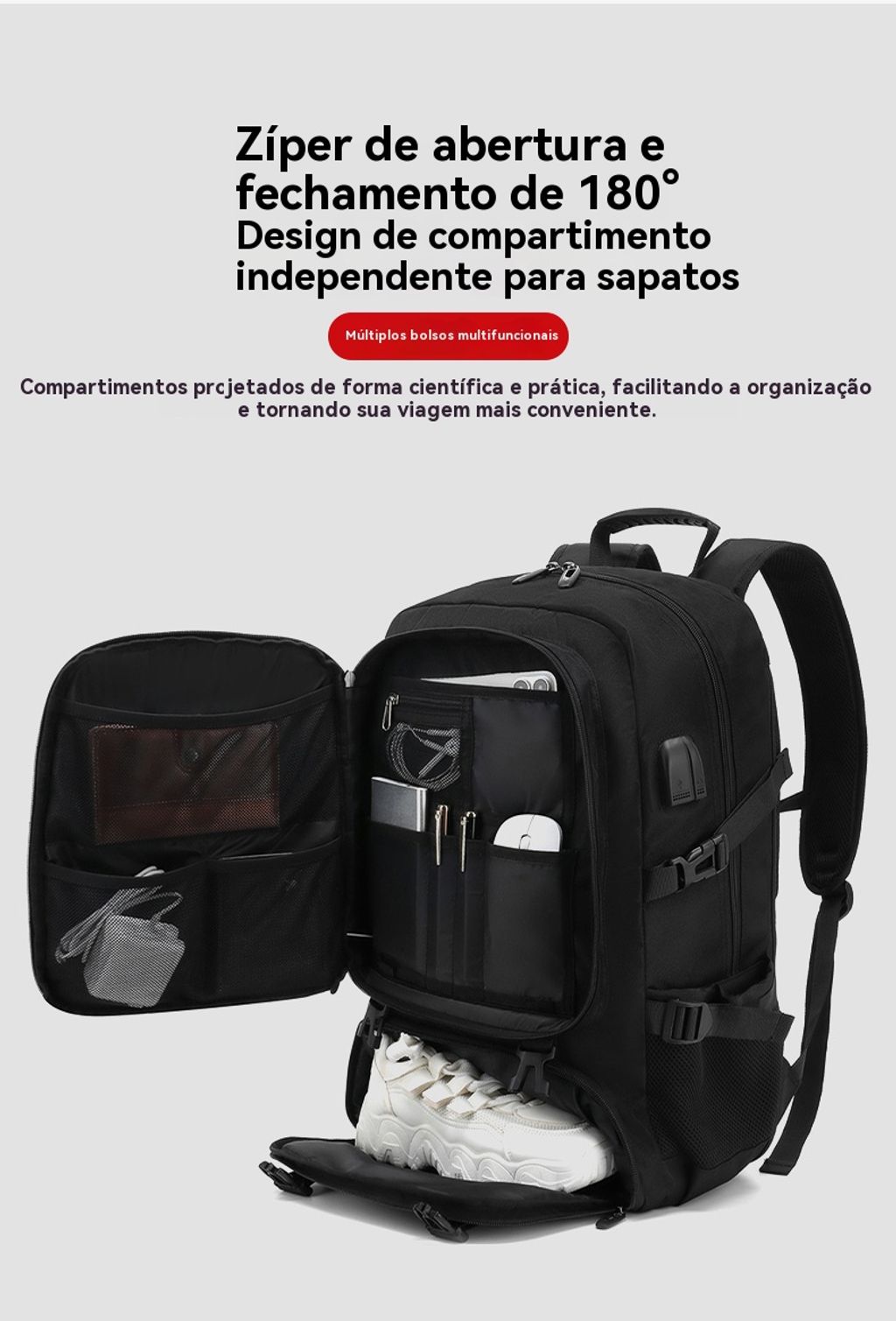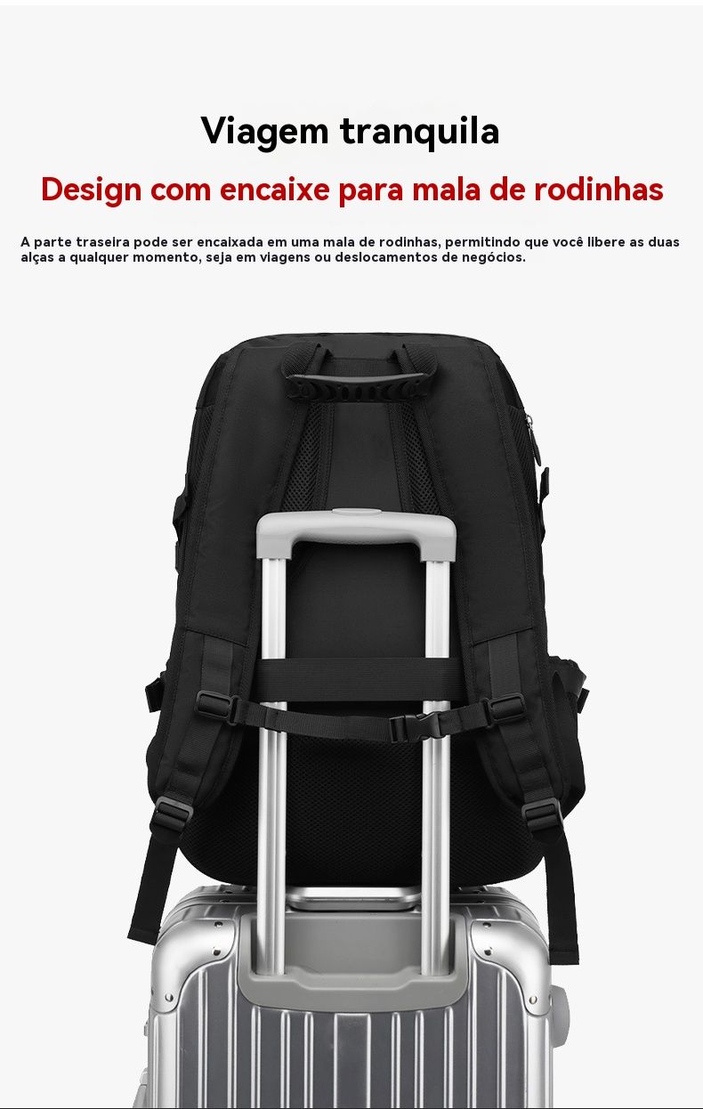 A Mochila de 80L foi feita para viagens curtas ou longas. Grande capacidade para laptop, roupas e itens pessoais, e pode ser levada no avião. Compartimento separado para sapatos, abertura de 180°/270° e encaixe na mala de viagem.